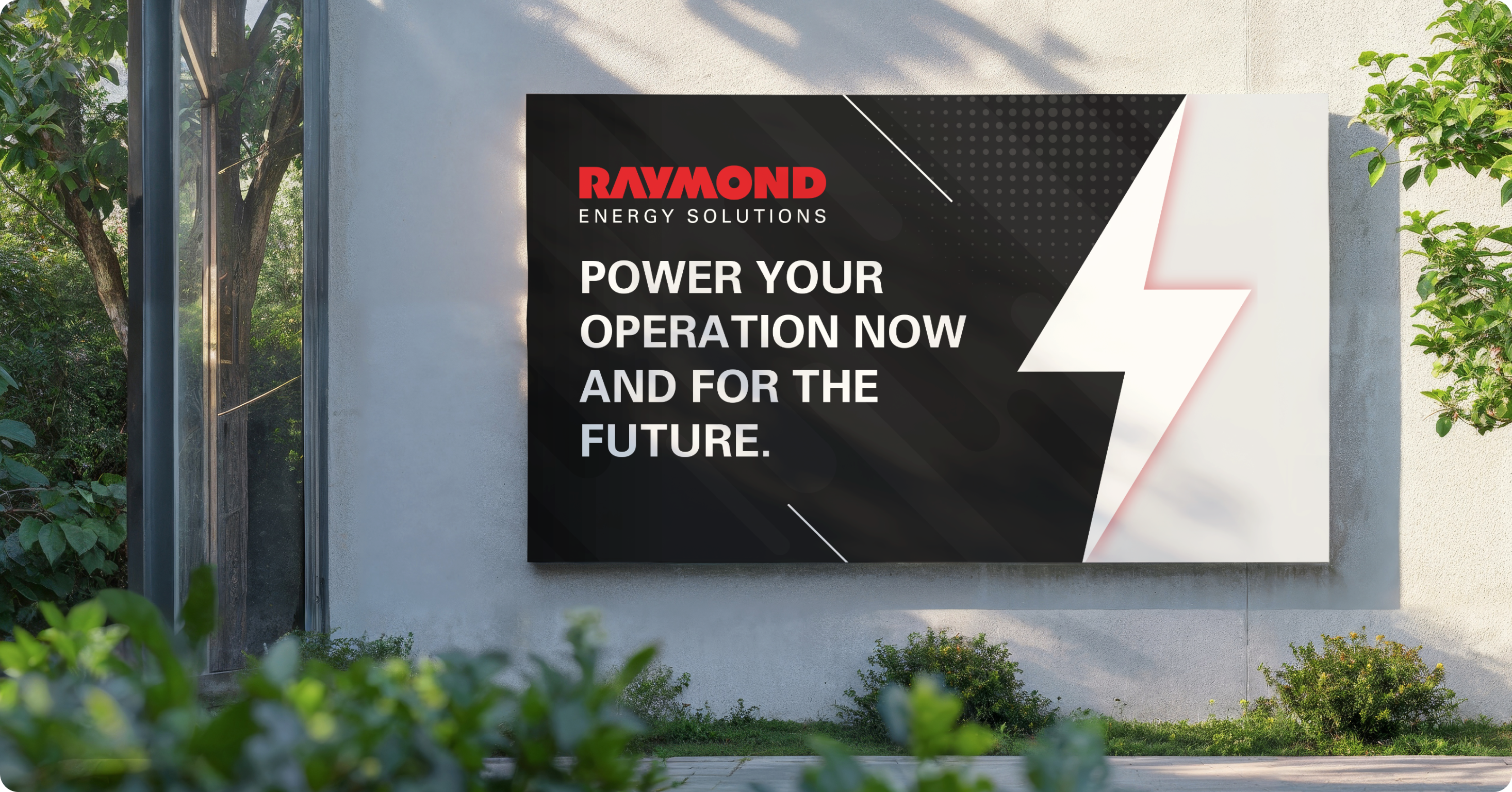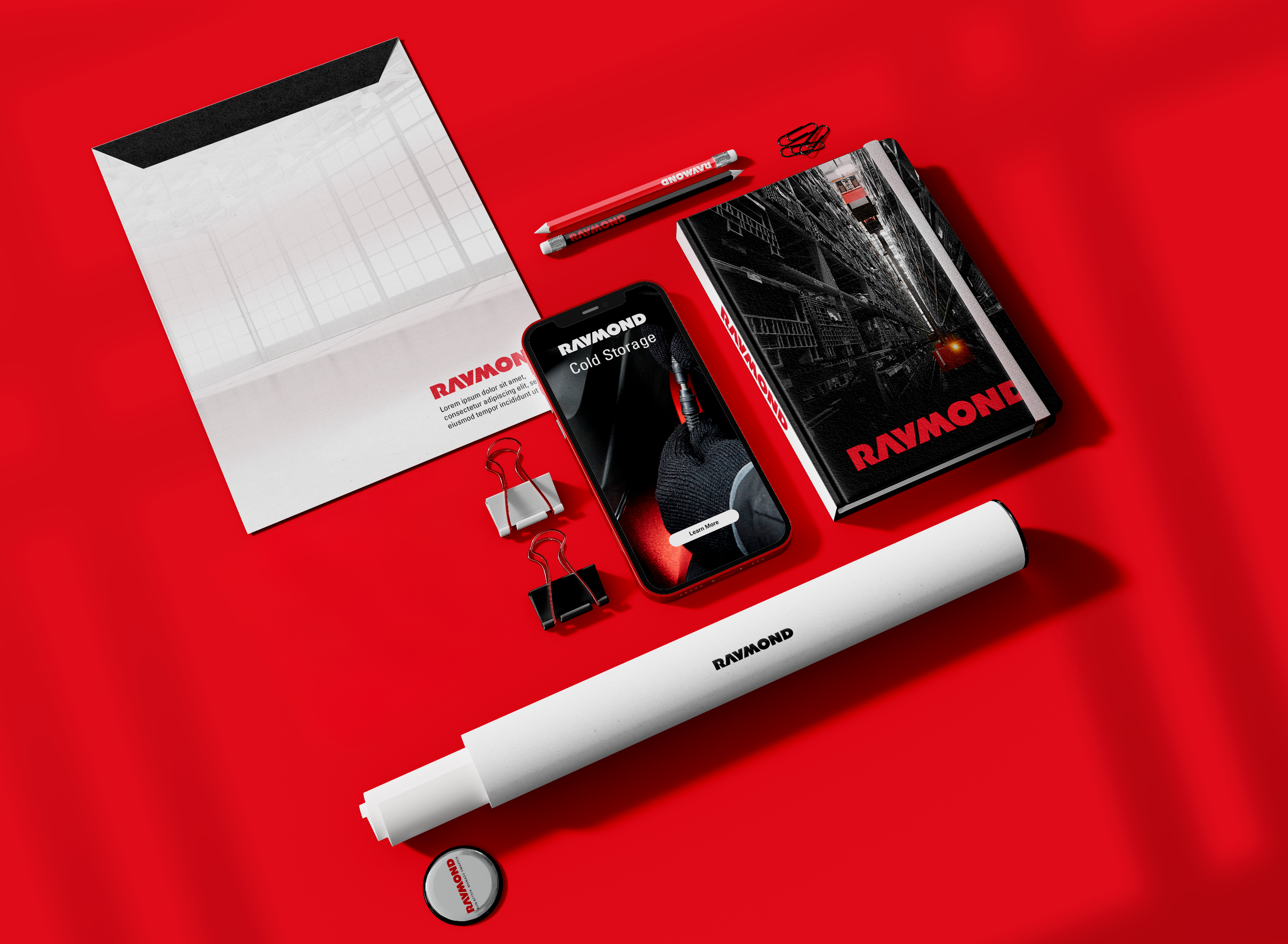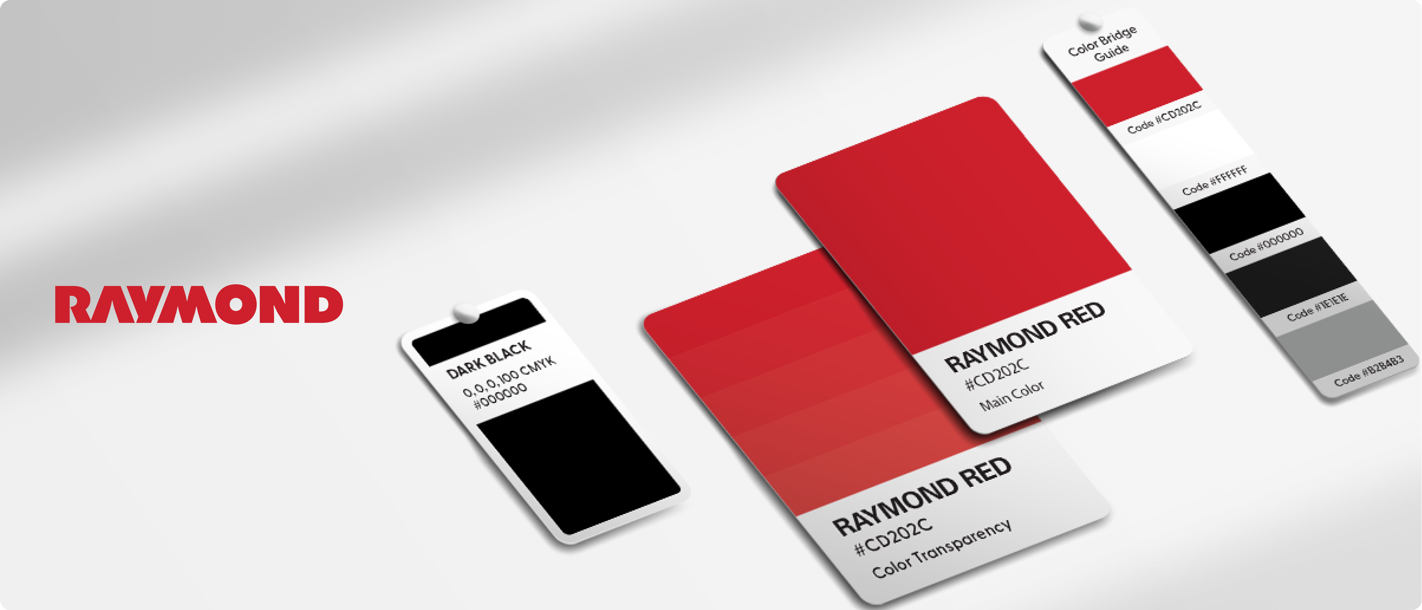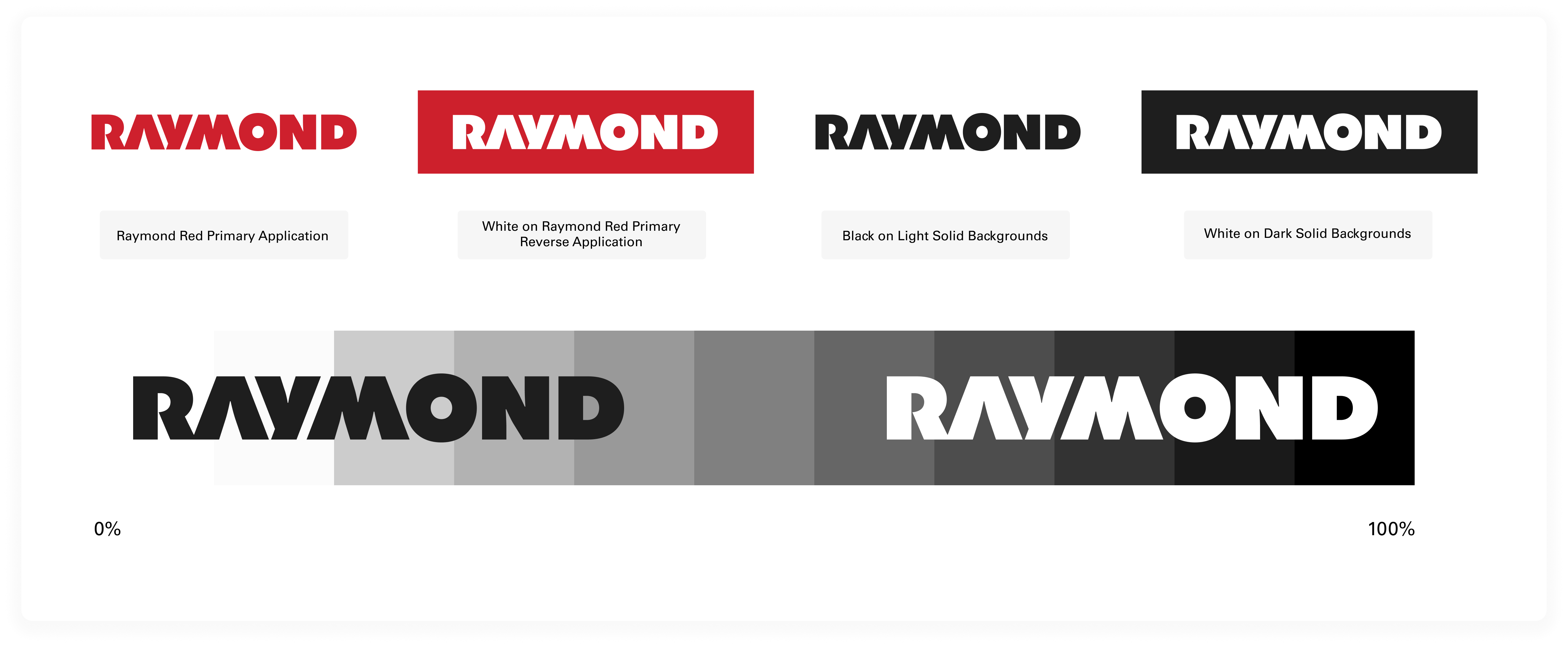 Variations of the Raymond logo have been developed based on a consistent foundation, all adhering to the established Raymond brand guidelines.