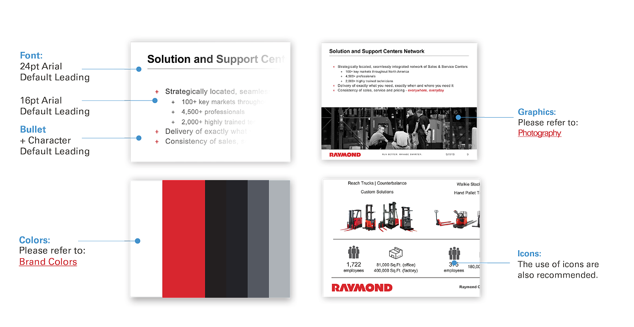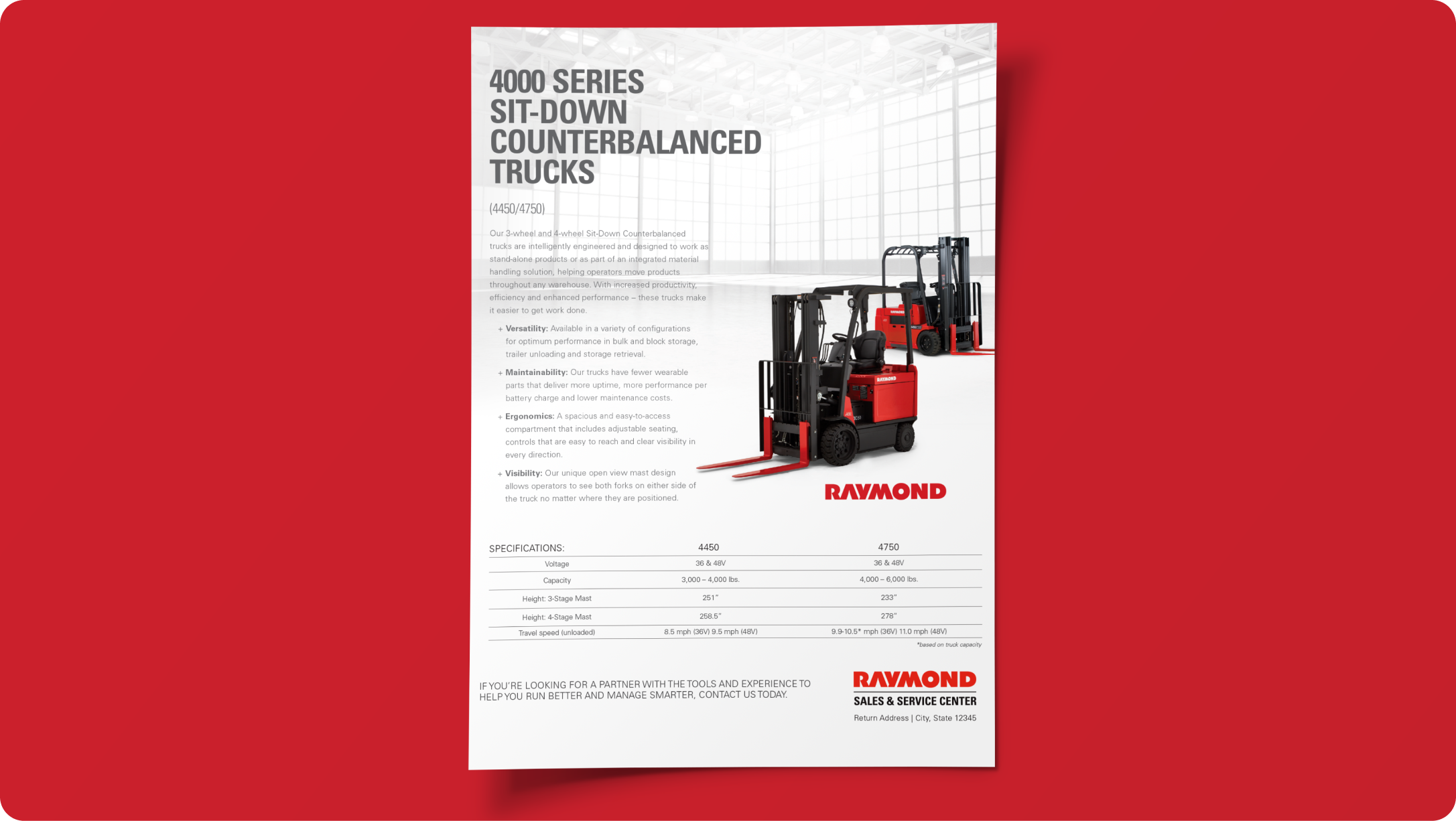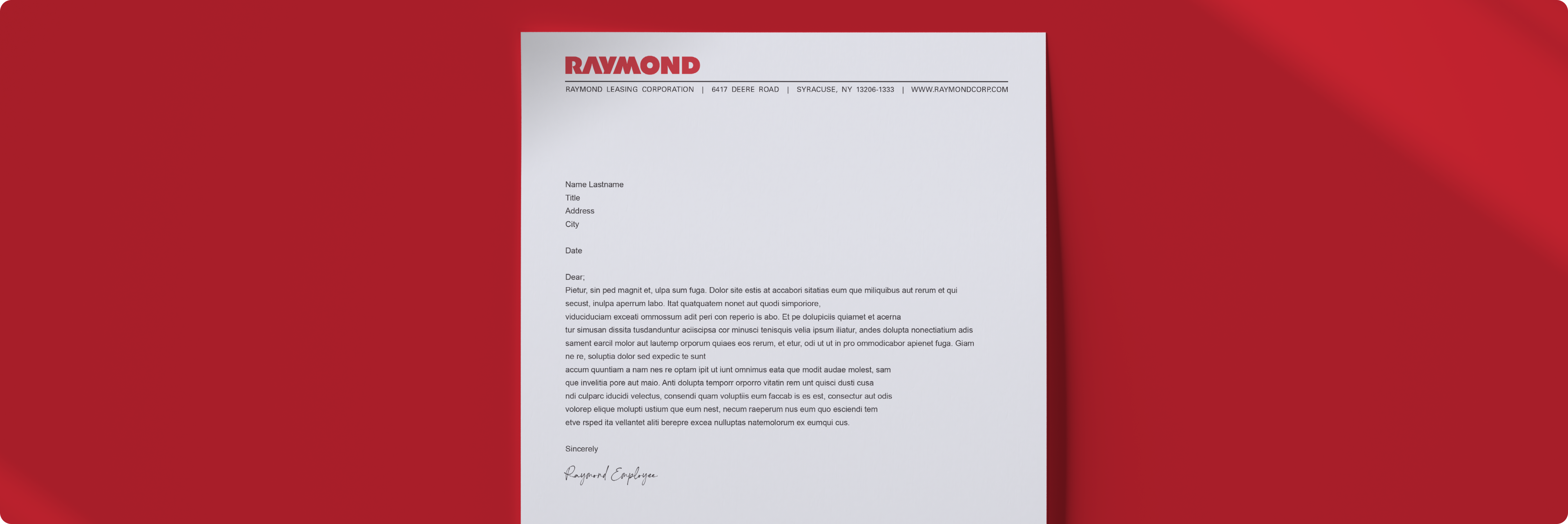 All Raymond press releases and collateral material including, but not limited to, sales manuals, brochures, sell sheets, videos, print ads and so on, must contain the copyright statement, including the year produced or updated (do not put a space between © and the year): ©2025 The Raymond Corporation