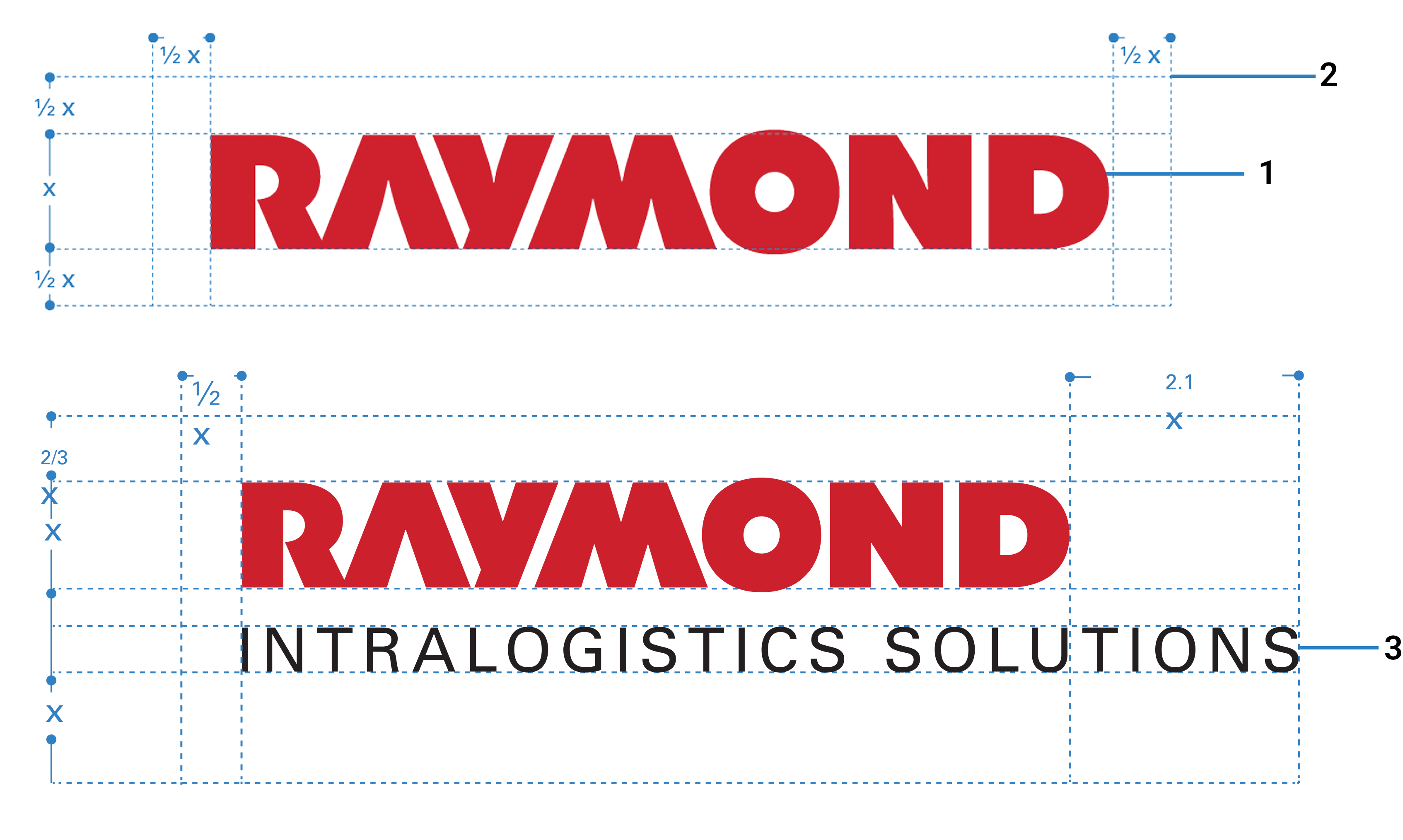 The clear area is a defined space around the Raymond logotype and the Raymond marketing signature. No other artwork or text should be placed within this area. The clear area also defines the minimum space allowable between the logotype or marketing signature and the edge of a business card, web screen, the corner of a display wall or similar situation. The clear area is defined as ½X. X is determined by the cap height of the Raymond logotype as shown here.