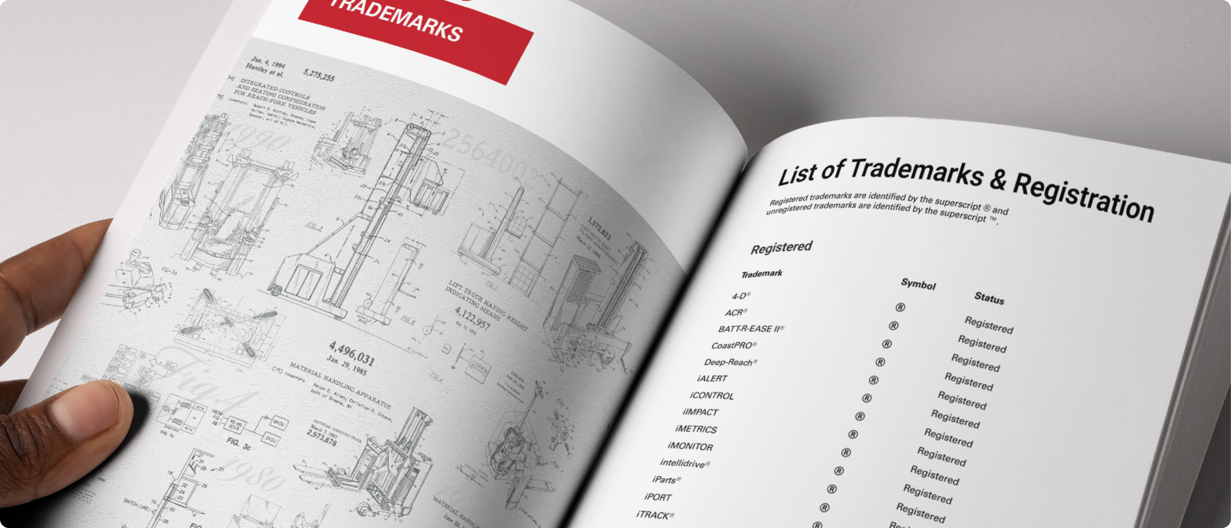 Do not use a trademark twice in the same product name. For example, use “Raymond Swing-Reach® truck,” but never use “Raymond® Swing-Reach® truck.” Use the trademark on the company name the next time it occurs with a product name or references products (e.g., “Raymond® Swing-Reach truck,” or Raymond® 5000 Series).