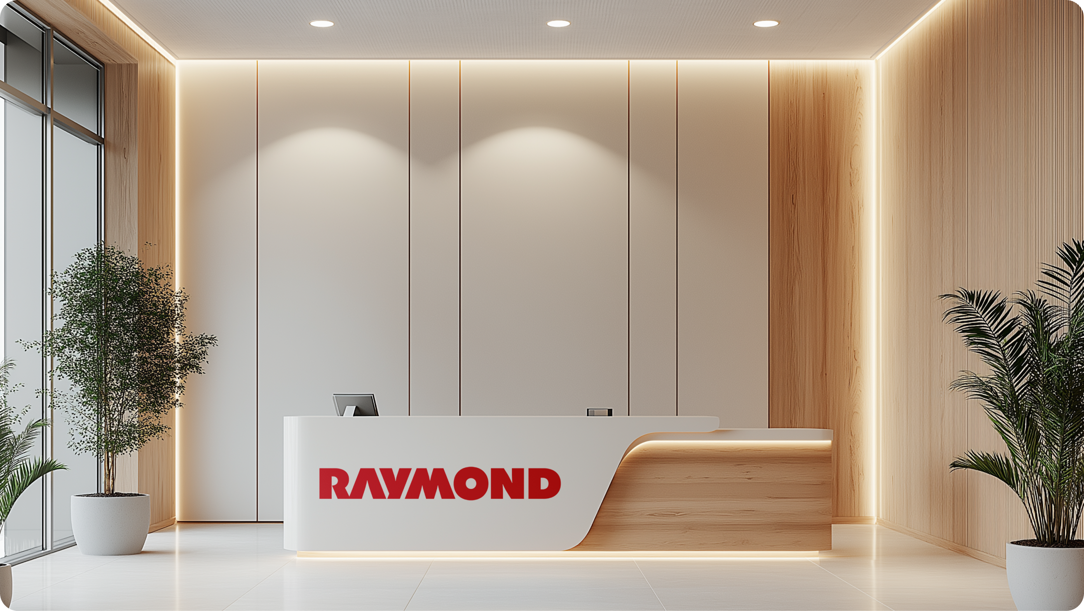 The standard Raymond logo should be used in most applications, ideally on solid white, dark, or neutral backgrounds for maximum visibility and brand consistency.