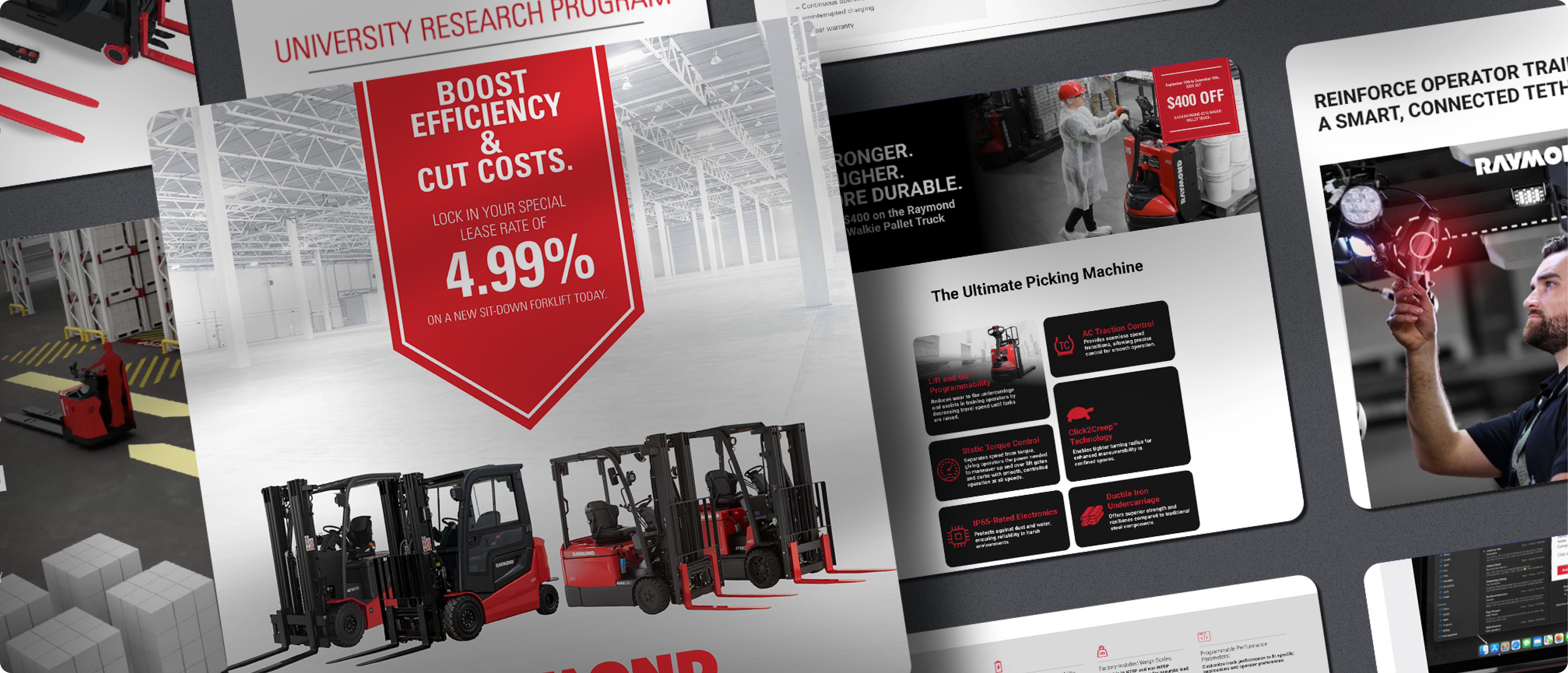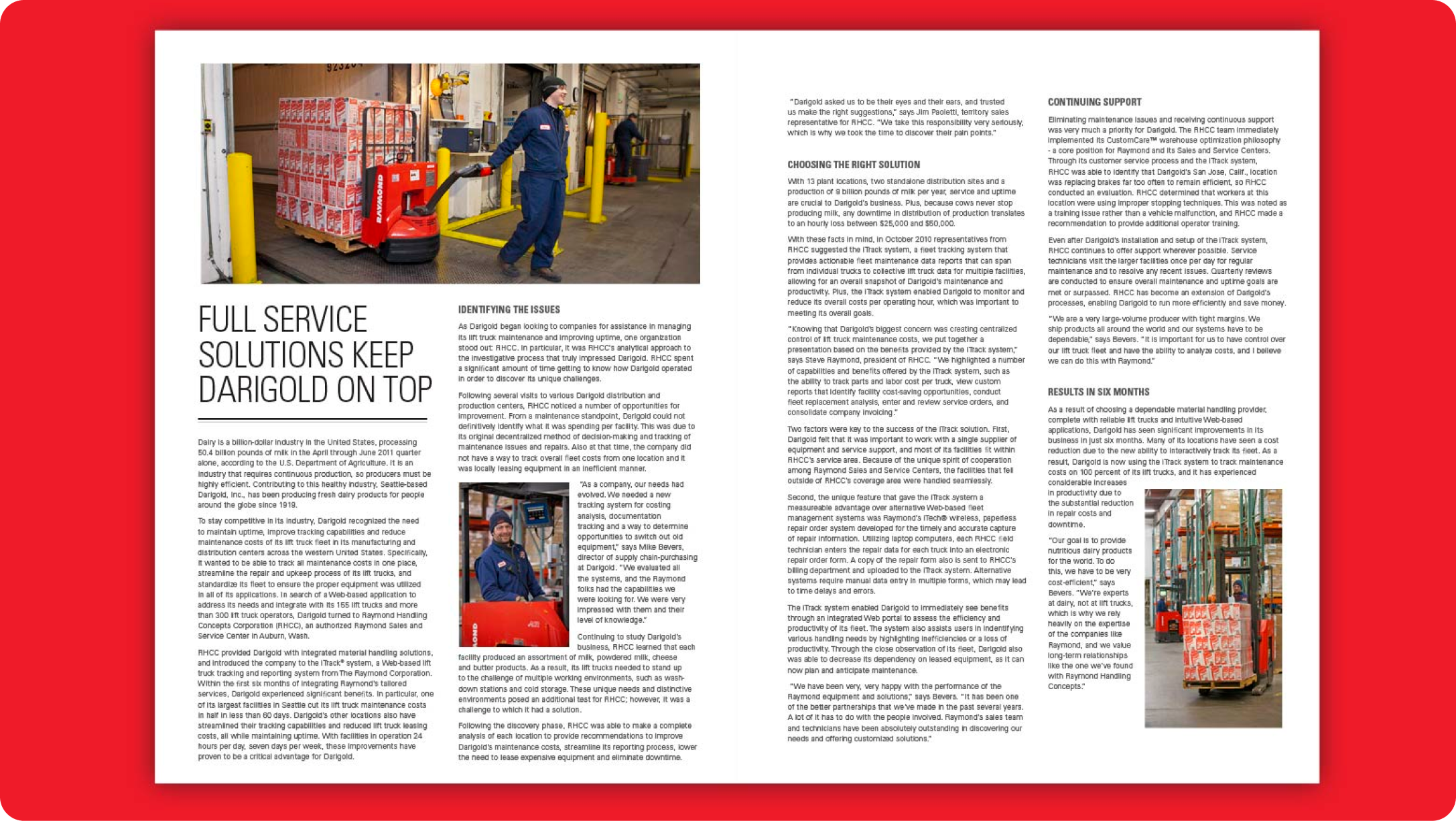 Brand Marketing also works to regularly identify customers for profiling in case study articles, which can be published in trade magazines, posted to websites or used as sales tools. Solutions and Support Centers that wish to suggest Raymond customers for profiling in case study articles should contact Elizabeth Buza to provide details.
