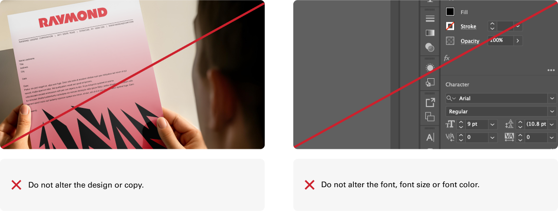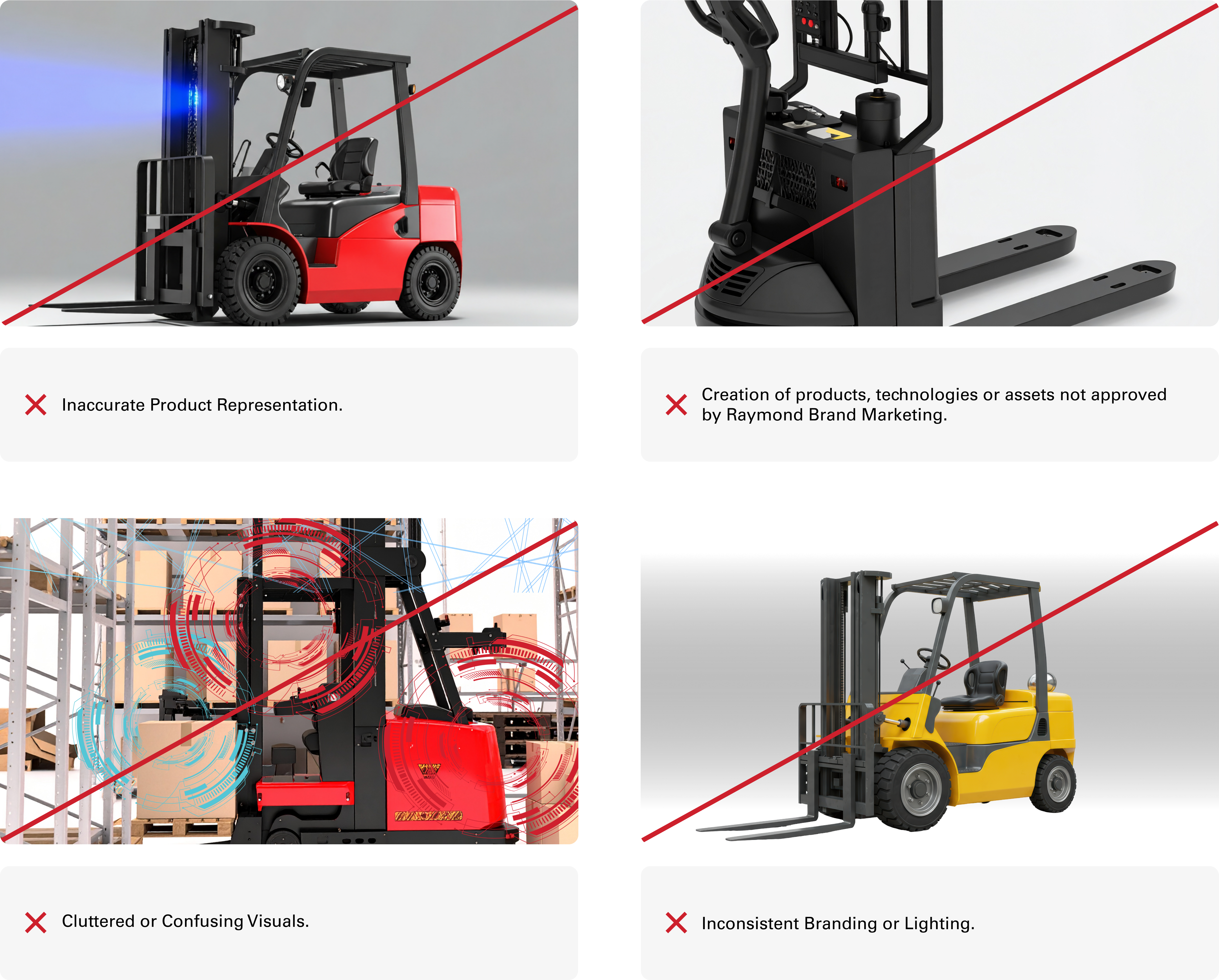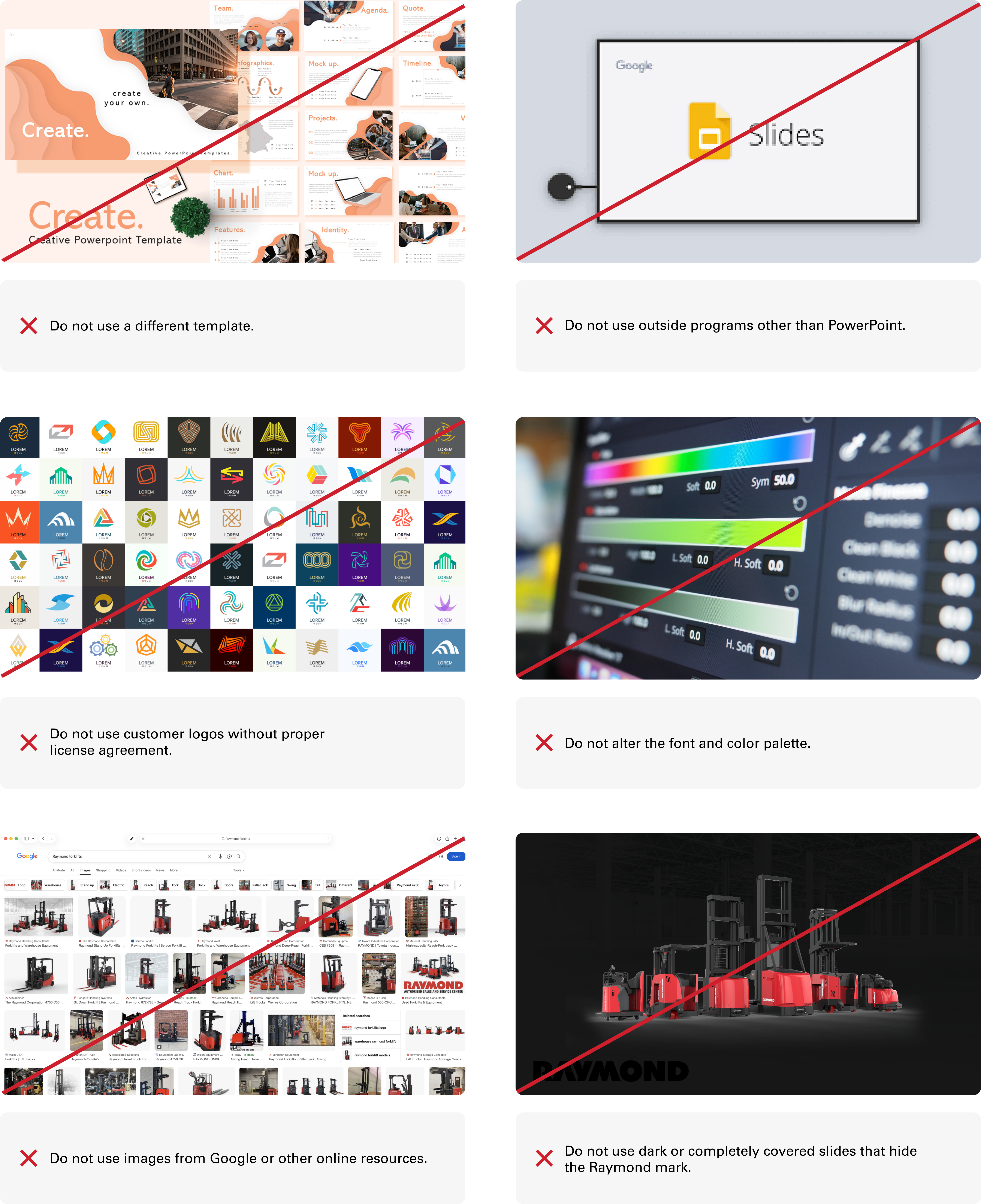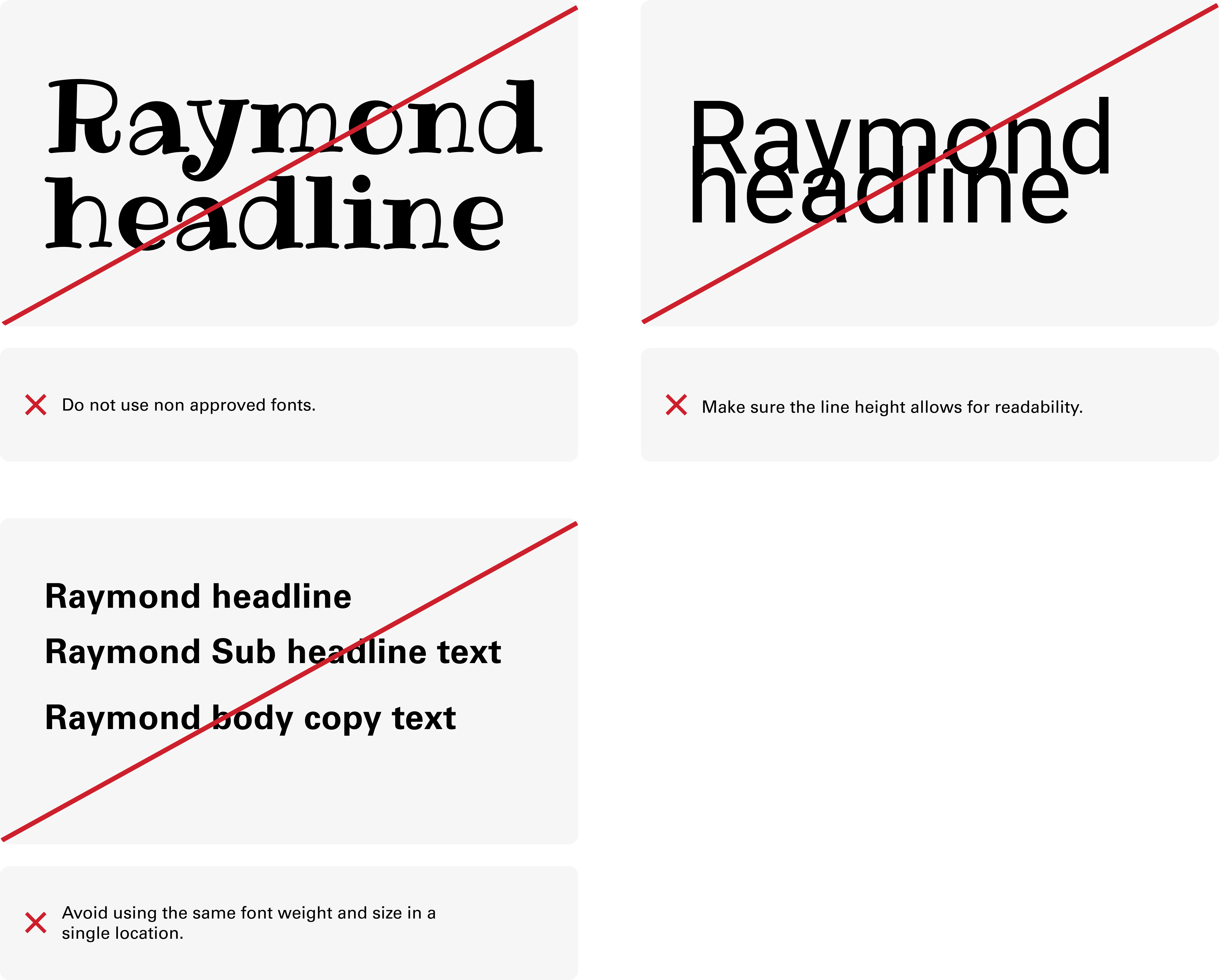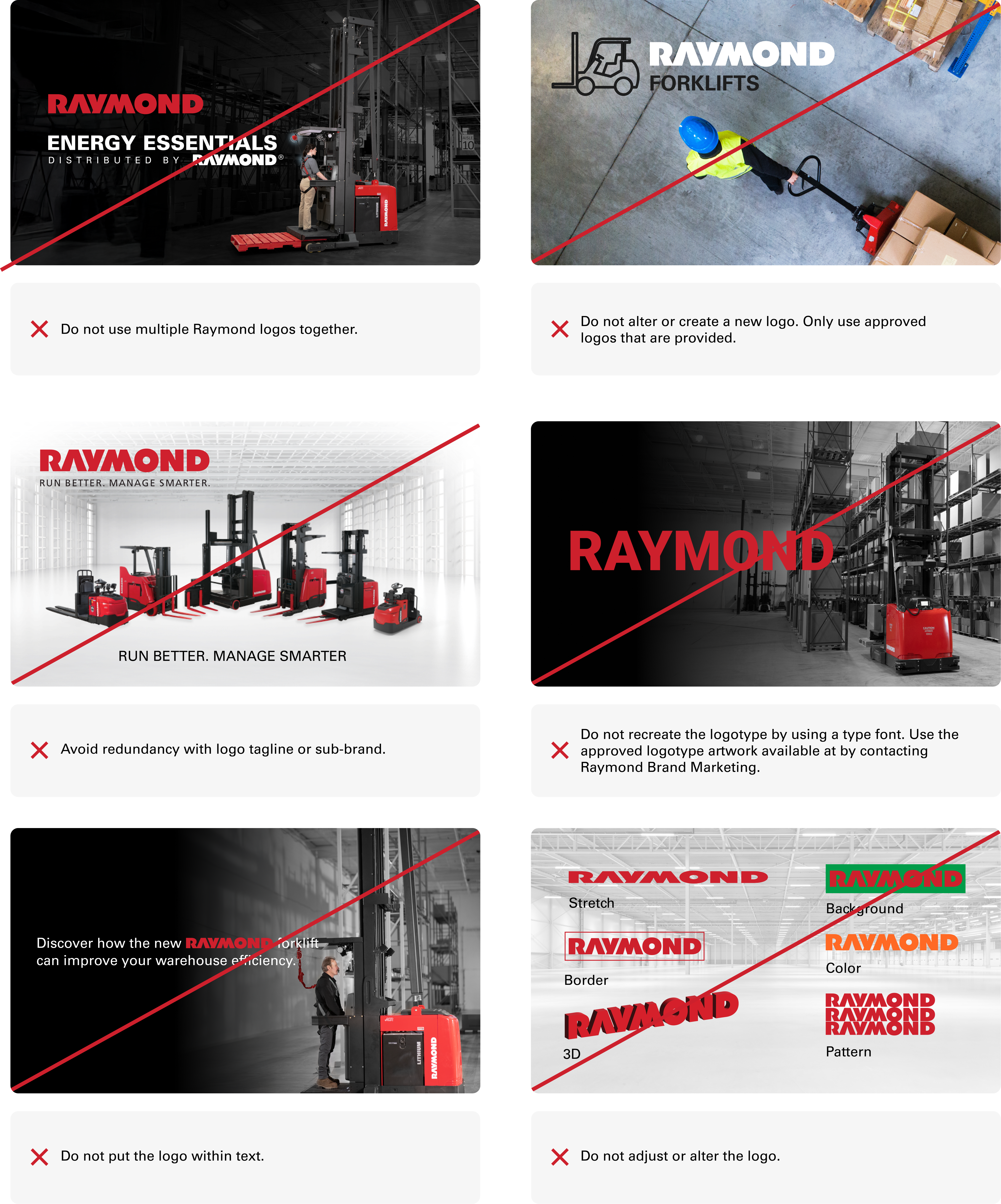 Follow guidelines to avoid these examples of the improper use of the Raymond logotype.