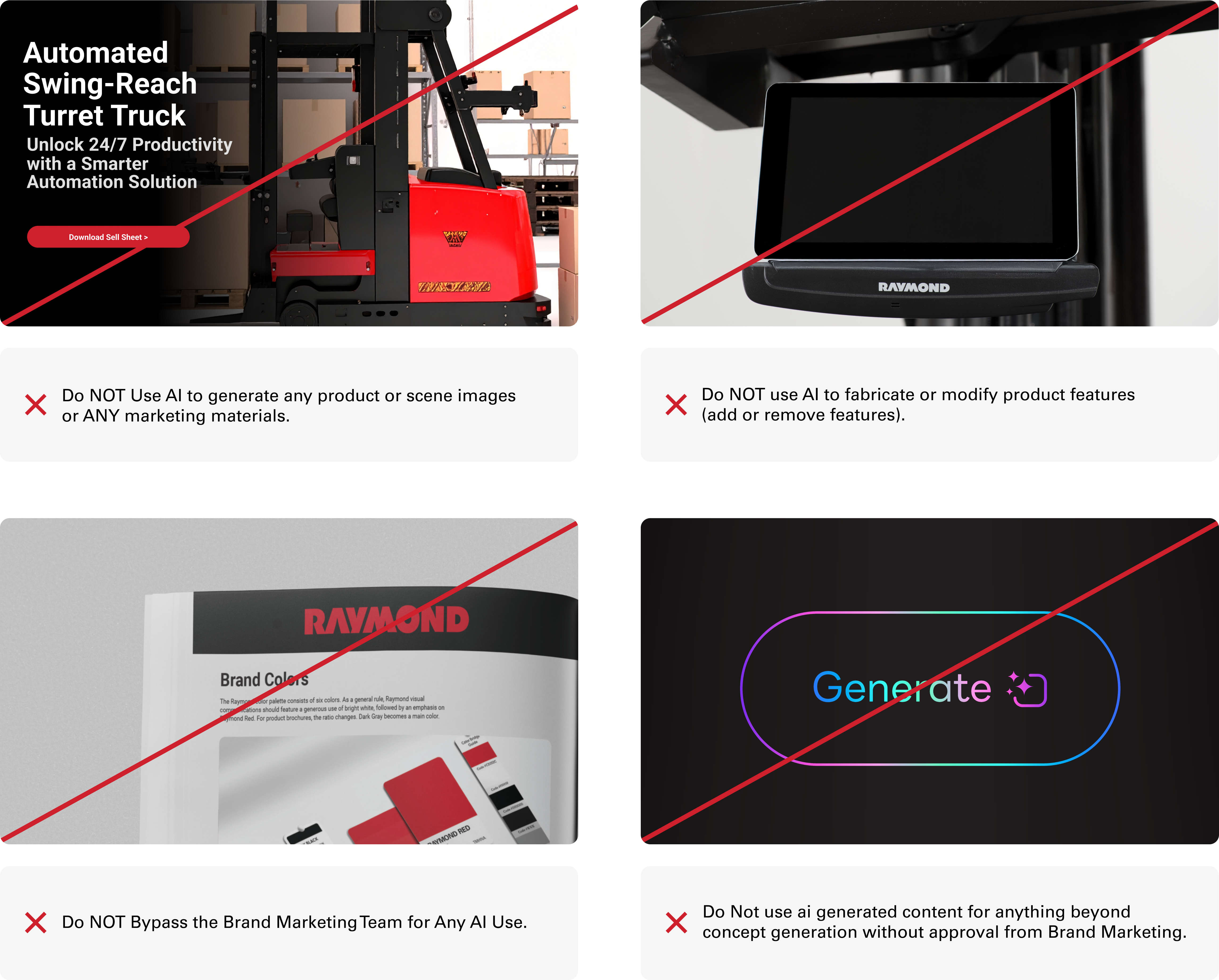 Creating a logo or adding an identifier without going through the Marketing and Communications team. Double use of Raymond and Ray in a product name are prohibited (ie. Raymax, eRay, Raydrive).If you need a new or an update to an existing logo, please contact Marketing and Communications for further assistance.